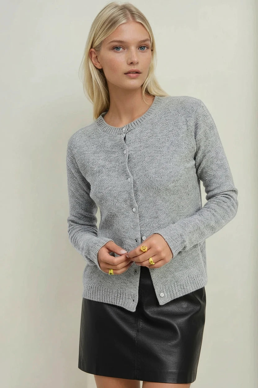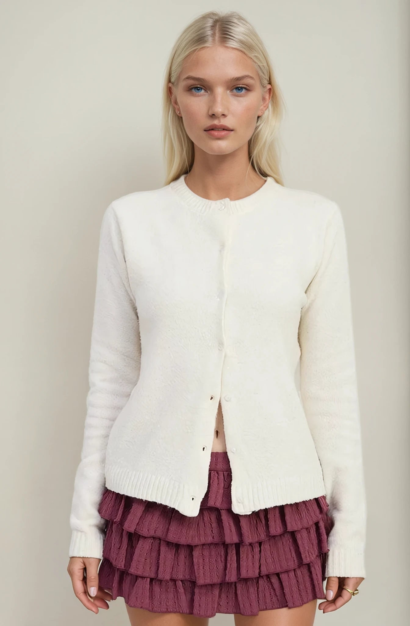 Elevate your everyday look with this sleek, body-hugging cardigan. Designed with a flattering silhouette and soft stretch fabric, it features a classic button-up front with contrast buttons for a touch of charm. Whether layered over a cami or worn solo, this piece transitions effortlessly from casual to chic.